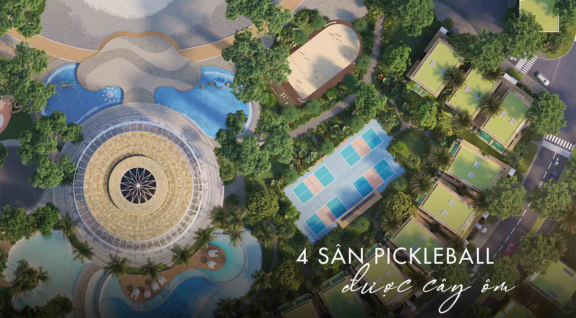 Sôi động nhưng đầy riêng tư, các sân Pickle ball, thể thao đa năng được bố trí hài hòa, lọt thỏm dưới những tán cây xanh mát.